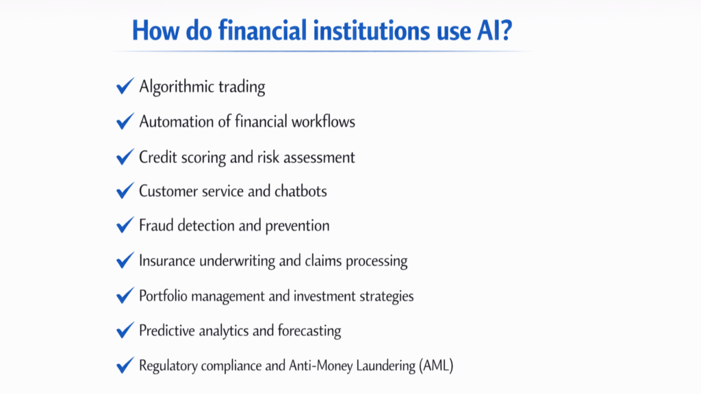 • Financial institutions use AI for fraud detection, credit scoring, AML, forecasting, and customer service.