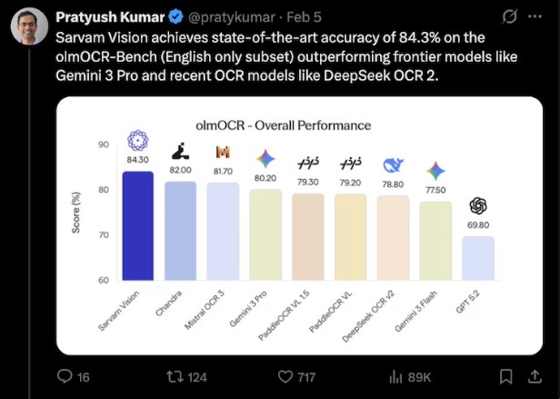 An Indian company, Sarvam AI, released a vision model that can read text from images (OCR) very well. In some tests, it performed better than Google’s Gemini 3 model. They also have a voice model that competes well with global companies, showing that Indian AI technology is advancing rapidly.
